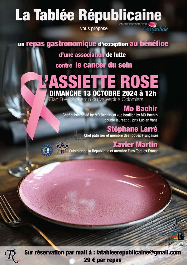 Il s’agit d’un repas élaboré à 6 mains par les chefs Mo Bachir, Xavier Martin et Stéphane Larré. Les bénéfices de ce repas gastronomique à 29€ seront reversés à l’association columérine Je vis en rose. Les participant.e.s pourront également faire des dons supplémentaires s’ils le souhaitent.
